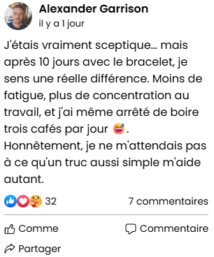 Kevin R.Verifié"Un boost naturel, sans artifices"J’ai arrêté les compléments et les boissons énergisantes.Ce bracelet m’apporte une énergie plus stable, plus naturelle.Je suis concentré, calme et efficace.Ça a vraiment changé ma routine.