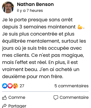 Théo R.Verifié"Moins de stress, plus de focus"Ce bracelet m’a surpris.Je le porte tous les jours, au travail comme en soirée.Je sens une vraie clarté mentale, moins de stress, et plus d’énergie.En plus, le design est top. Ça attire les regards !